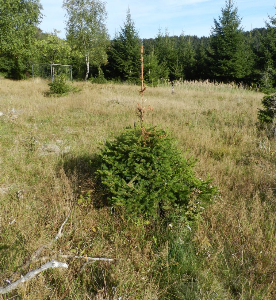 Seit 12 Jahren hat Rotwild diese Flächen entmischt und befreit von Kräutern. Es wachsen nur noch Gräser und Fichten in einer absolut artenverarmten Baumsteppe. Balzende Schmetterlinge auf „sonnenliebenden Kräutern“ sucht man auf diesen „kleinen Lichtungen“ vergebens. In den Rotwild- Kerngebieten ist dieses Bild einer von Hirschen offen gehaltenen Lichtung typisch.